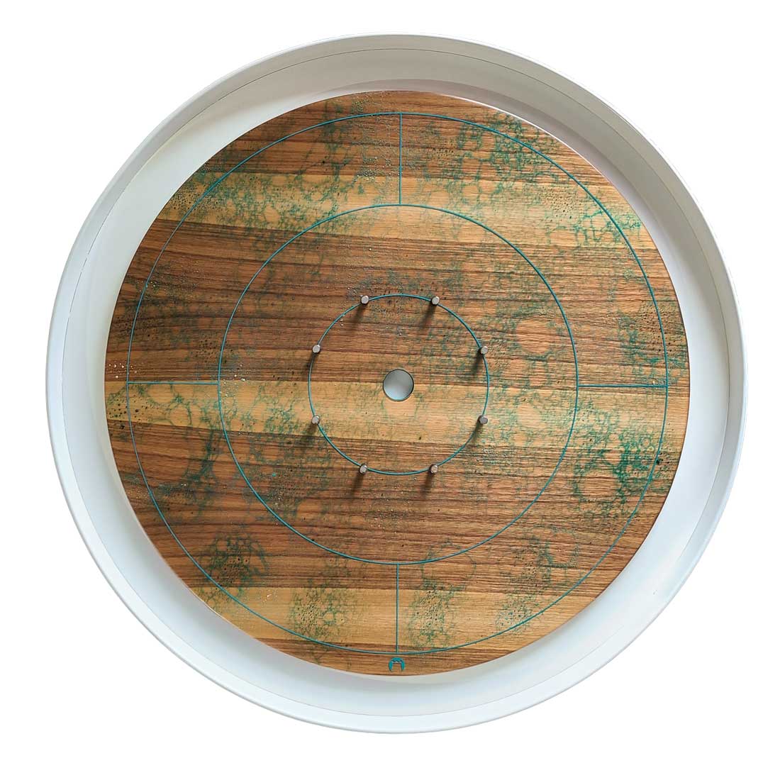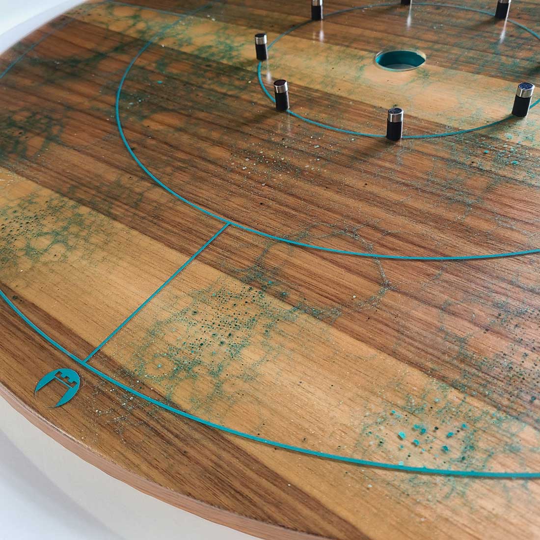 A unique resin Crokinole board featuring a water look on walnut with a white wooden rail.