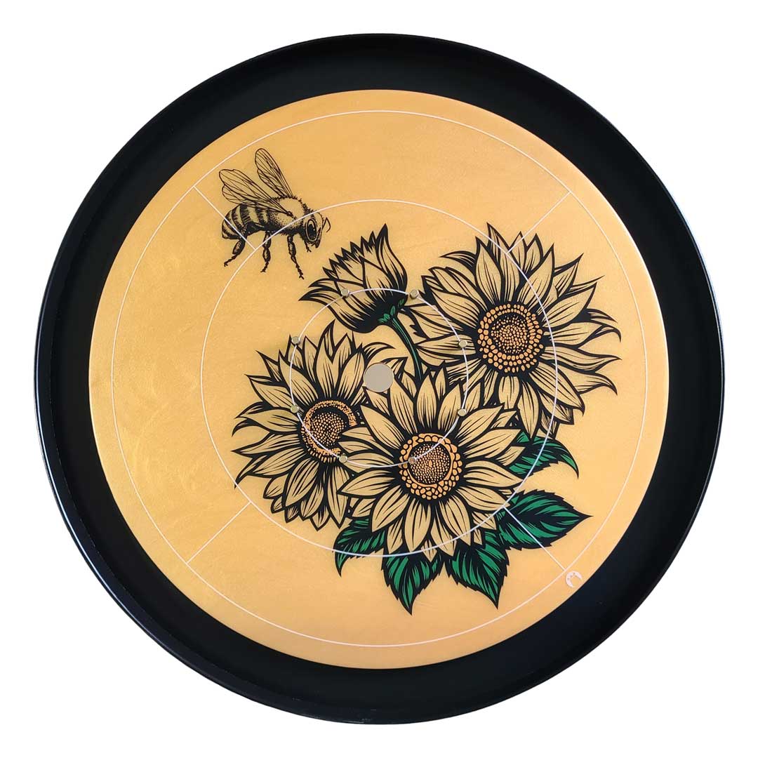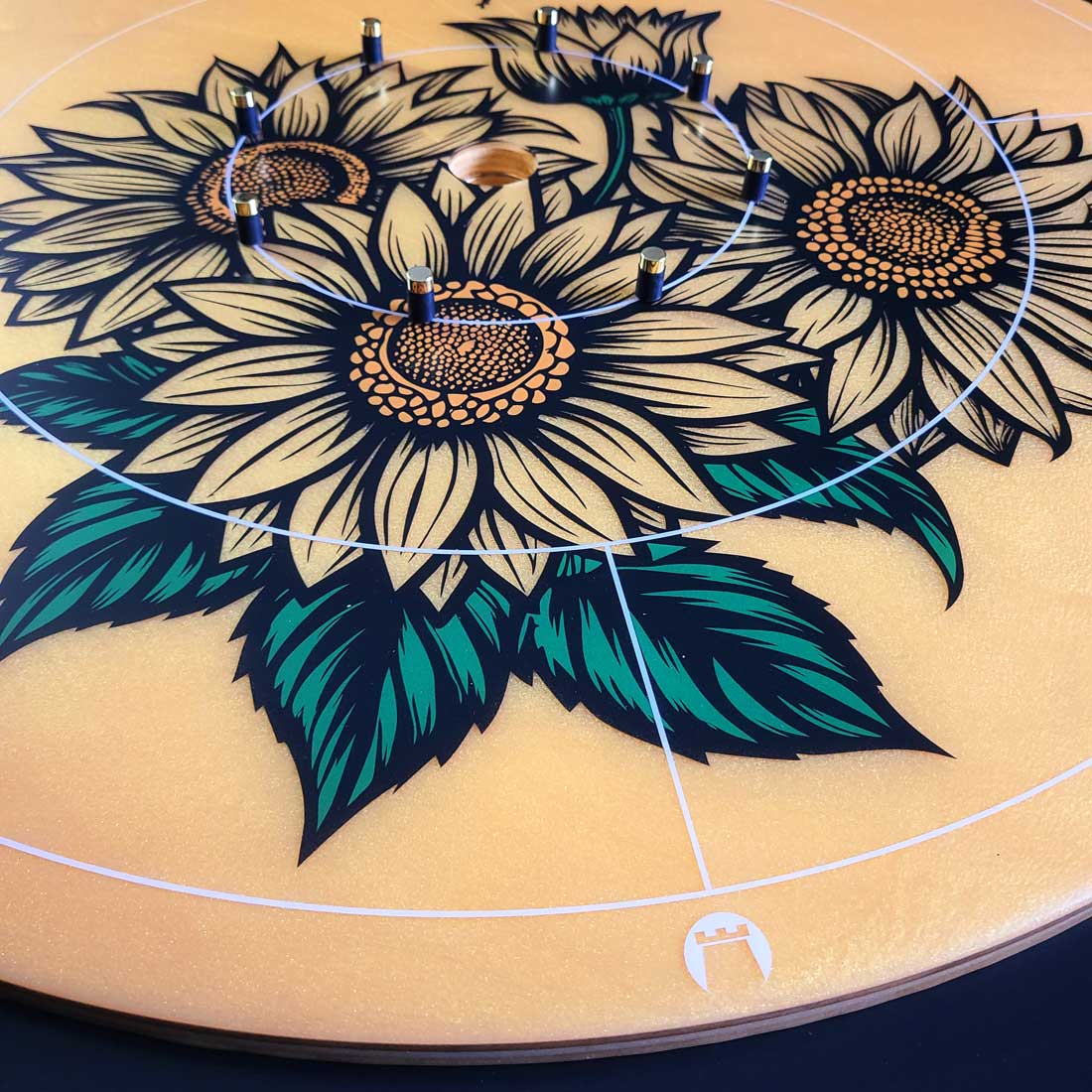 A one of a kind resin Crokinole board featuring sunflowers on a golden yellow, surrounded by a black wooden rail.