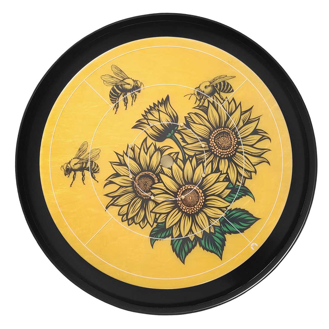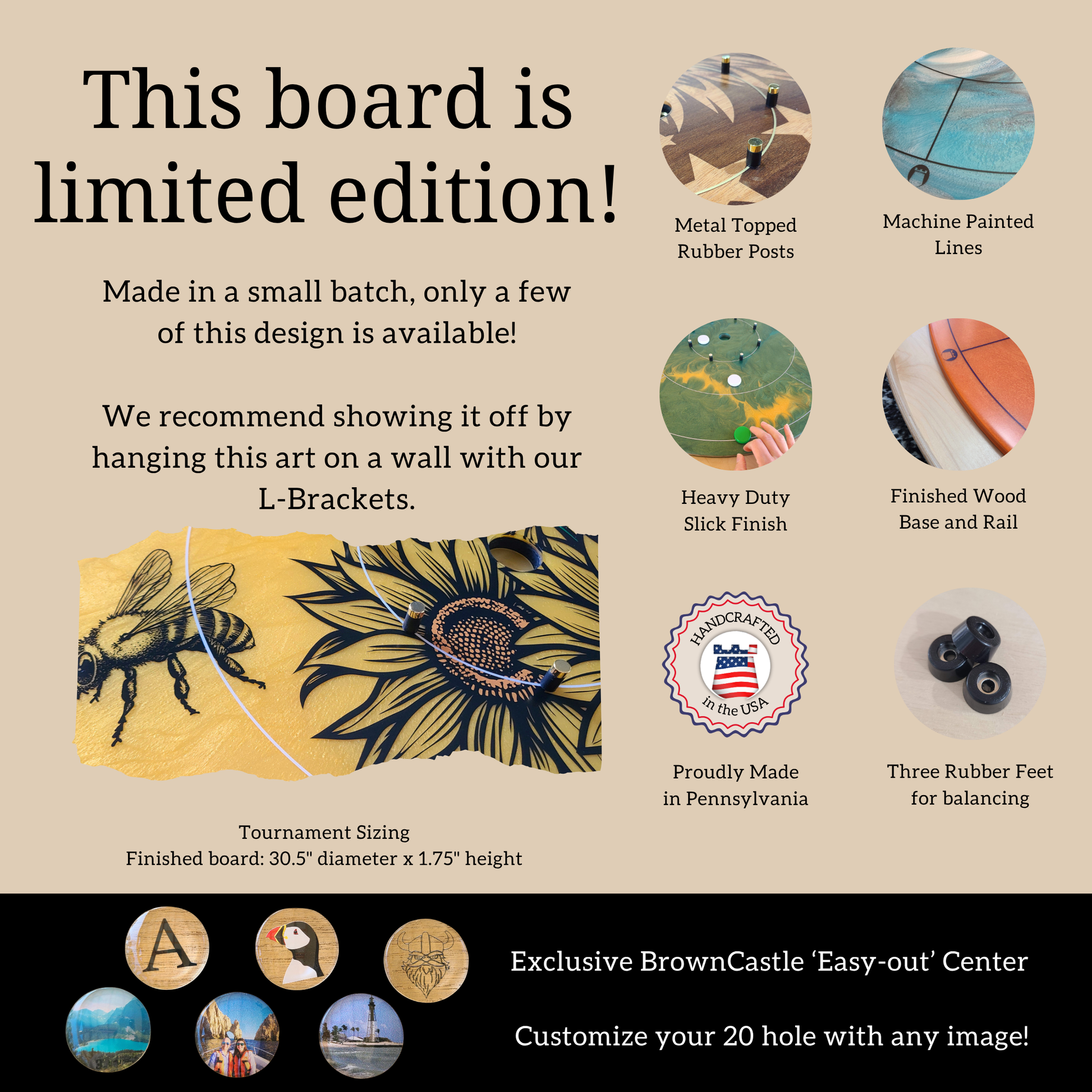 A limited edition resin Crokinole board featuring sunflowers on a golden yellow, surrounded by a black wooden rail.