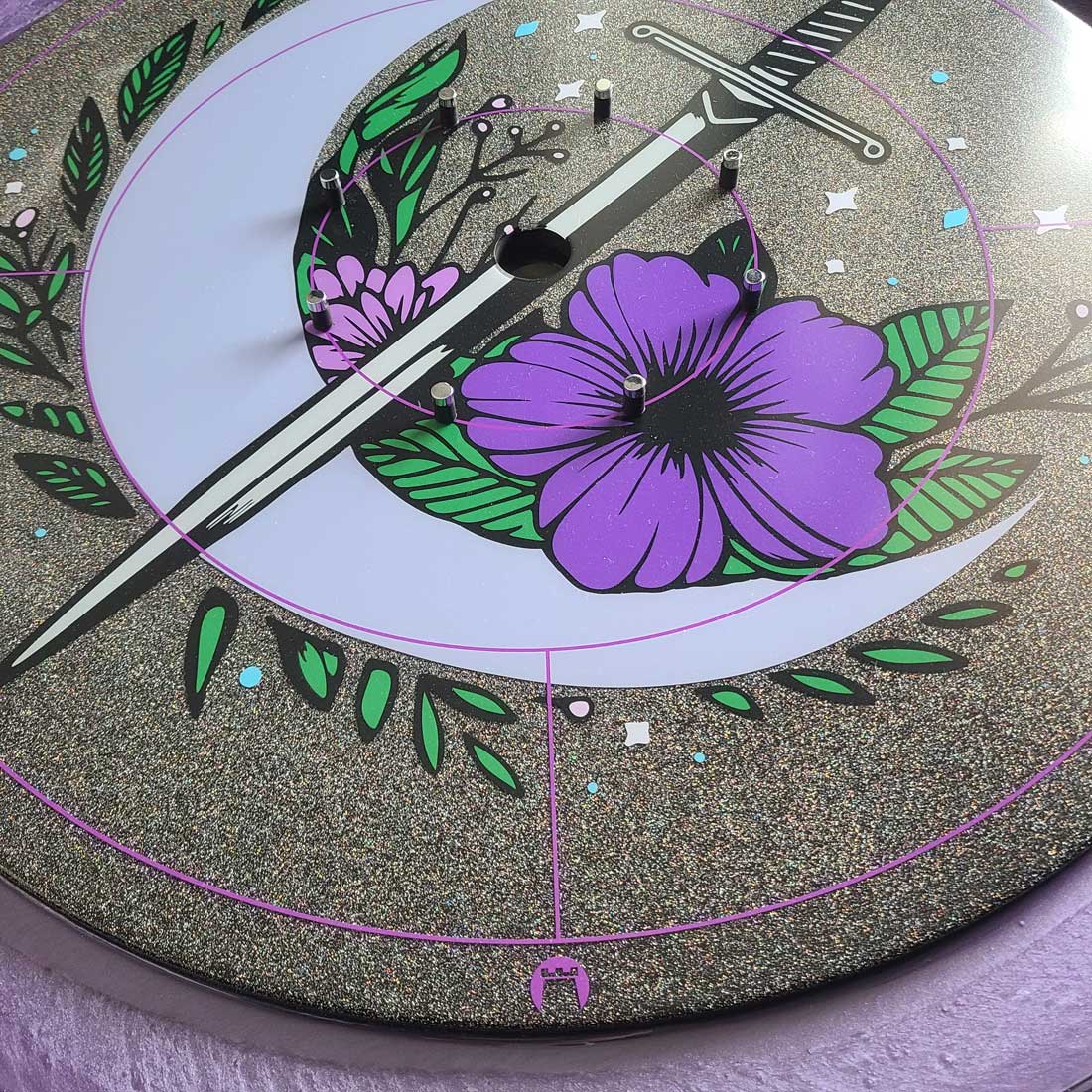 A one of a kind resin Crokinole board featuring a fantasy image in sparkles, surrounded by lavender resin and a black wooden rail.