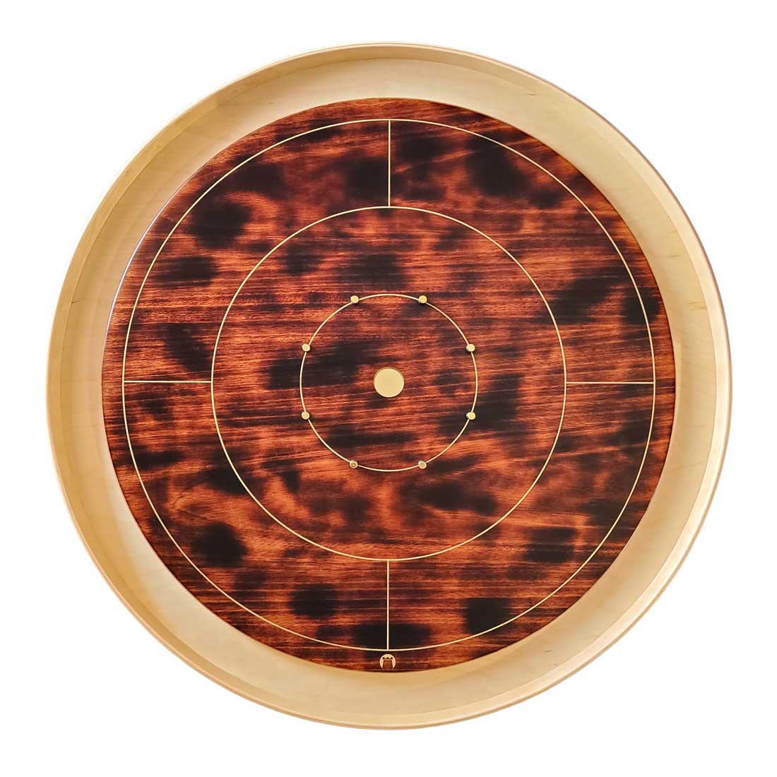 A one of a kind resin Crokinole board featuring burnt mahogany on a maple wood base.