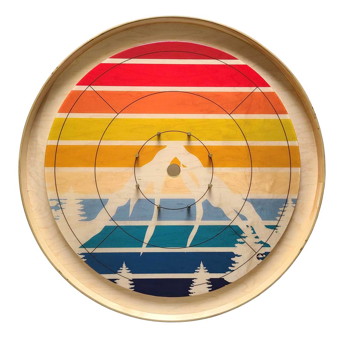 A retro rising sun image printed on maple and seated on a natural wooden rail.