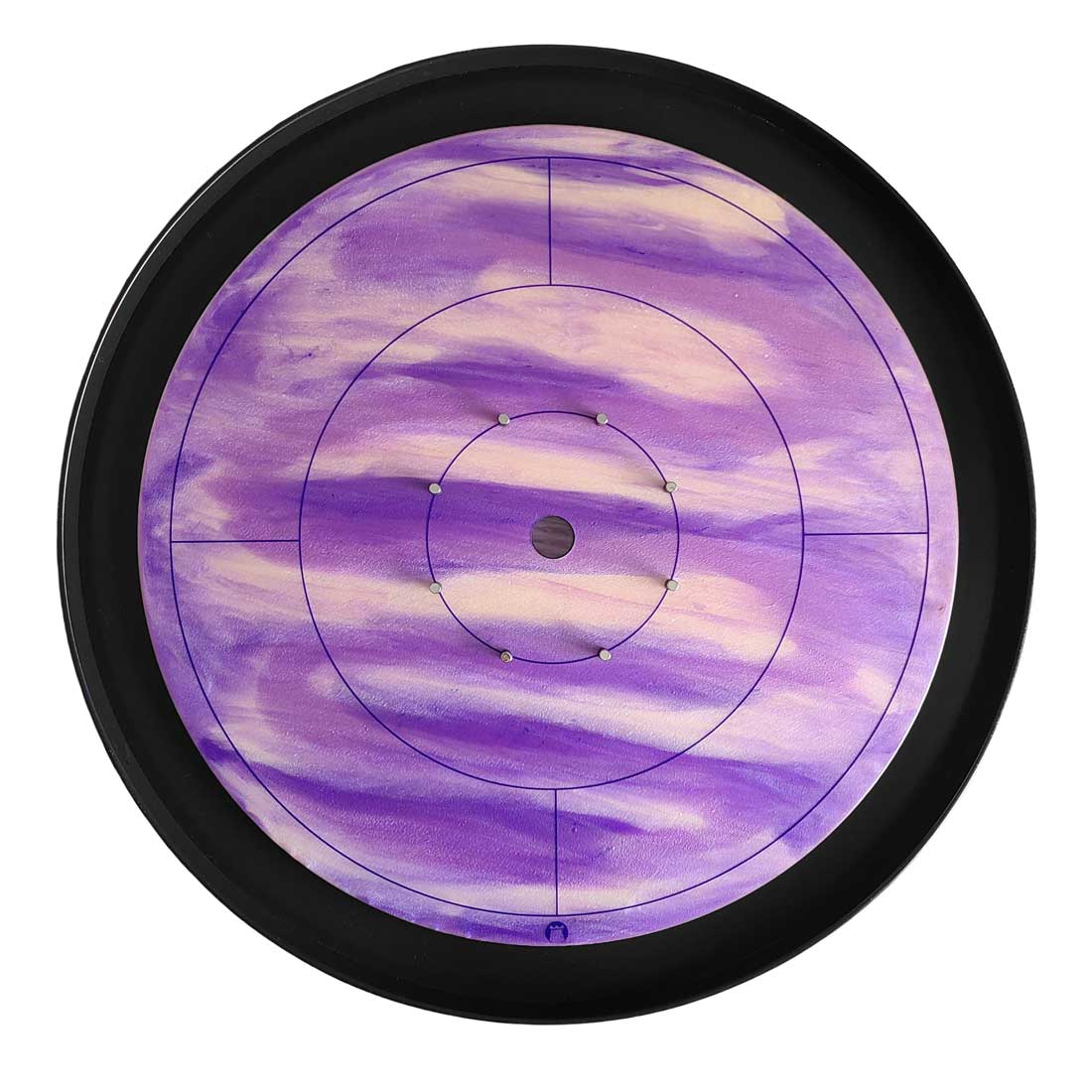 A one of a kind resin Crokinole board featuring multi tone purple pattern on a black wooden rail.