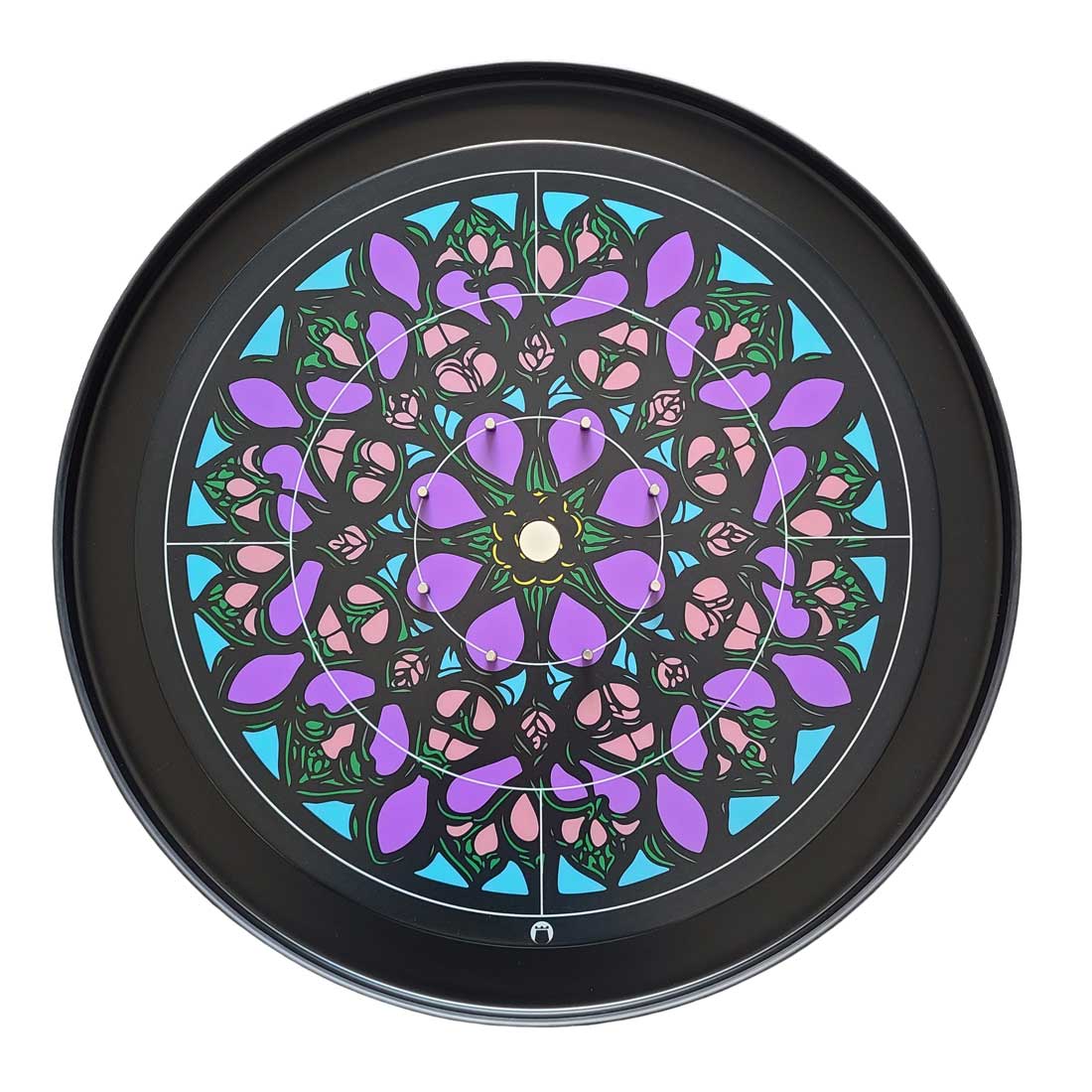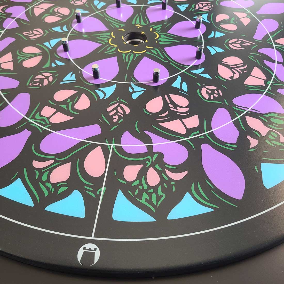 A one of a kind resin Crokinole board on a metal rail featuring a gothic window print.
