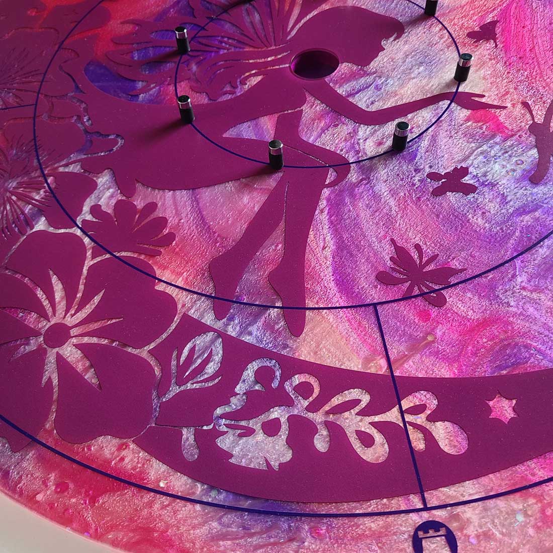 A unique resin Crokinole board featuring a fairy scene in a magical surface on a white wooden rail.