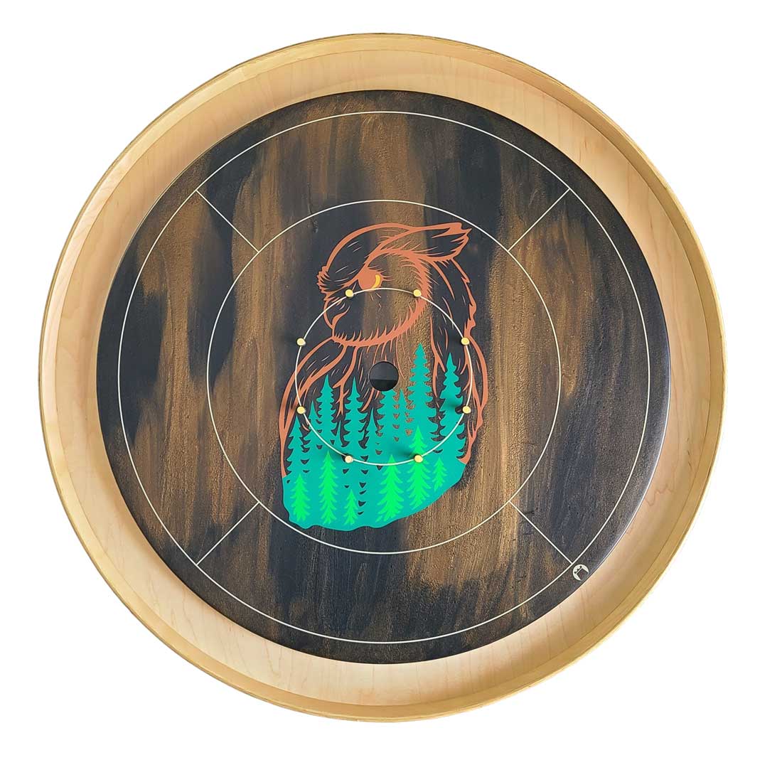 A one of a kind resin Crokinole board featuring a black and brown surface with a owl in the woods on a natural wooden rail.