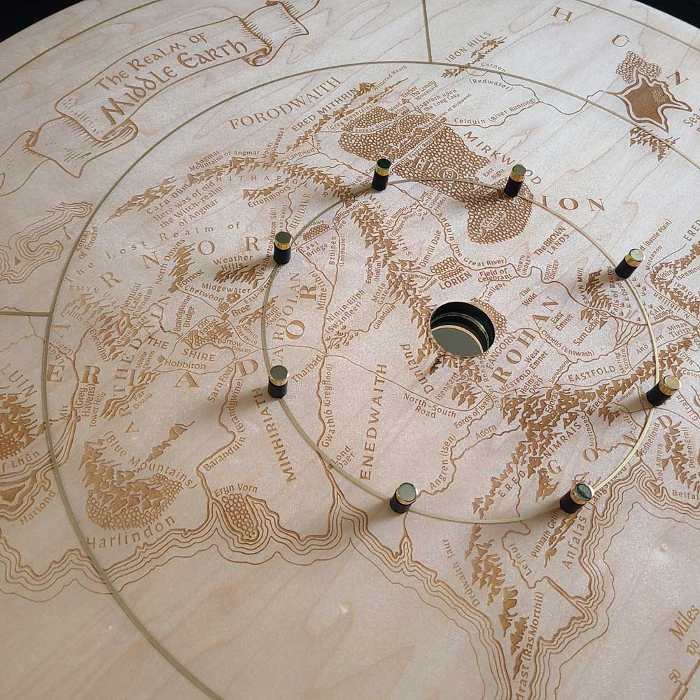 A limited edition resin Crokinole board for 2025 featuring the fan created map of Middle Earth on a metal rail.