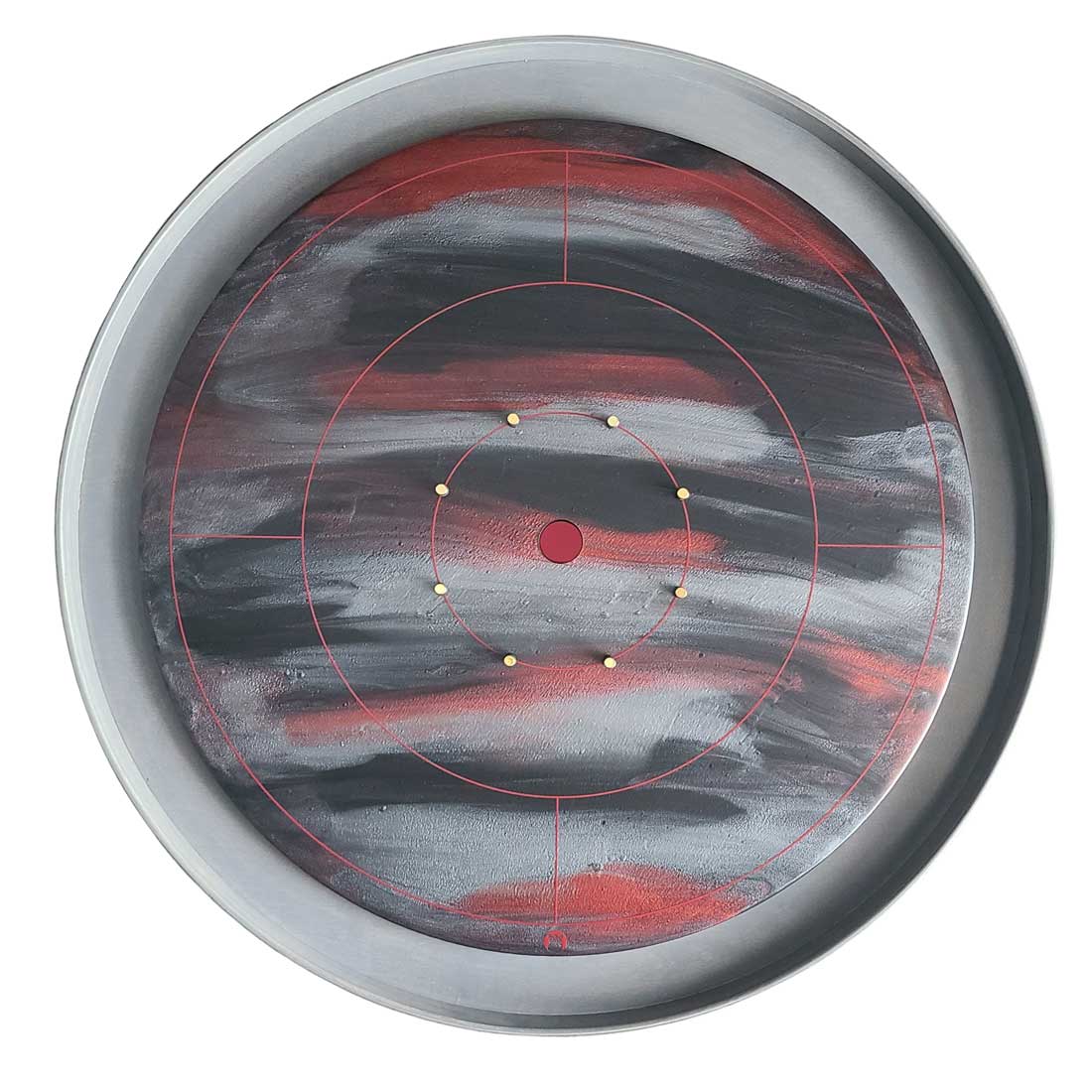A one of a kind resin Crokinole board featuring a lateral pattern of deep red with black and grey on a grey stained wooden rail.
