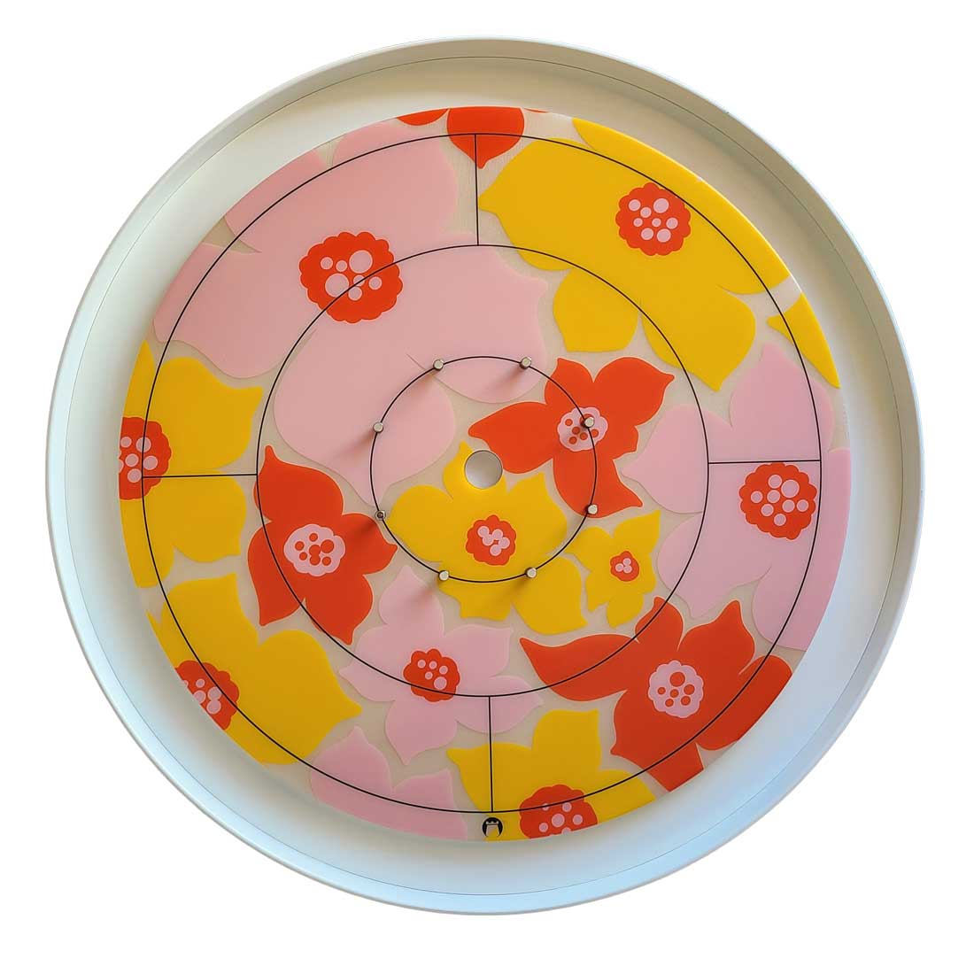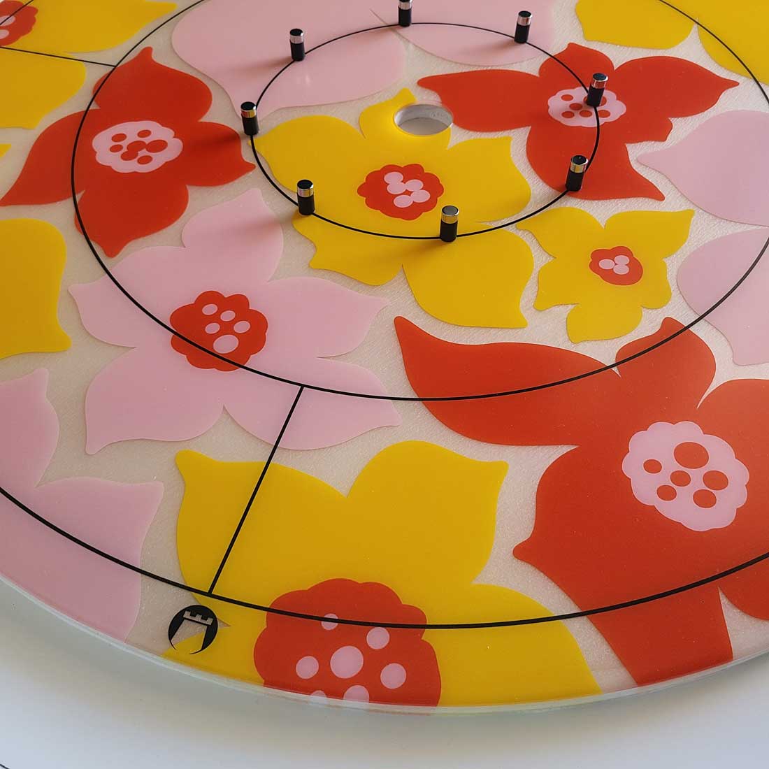 A unique resin Crokinole board featuring a floral pattern and a white wooden rail.