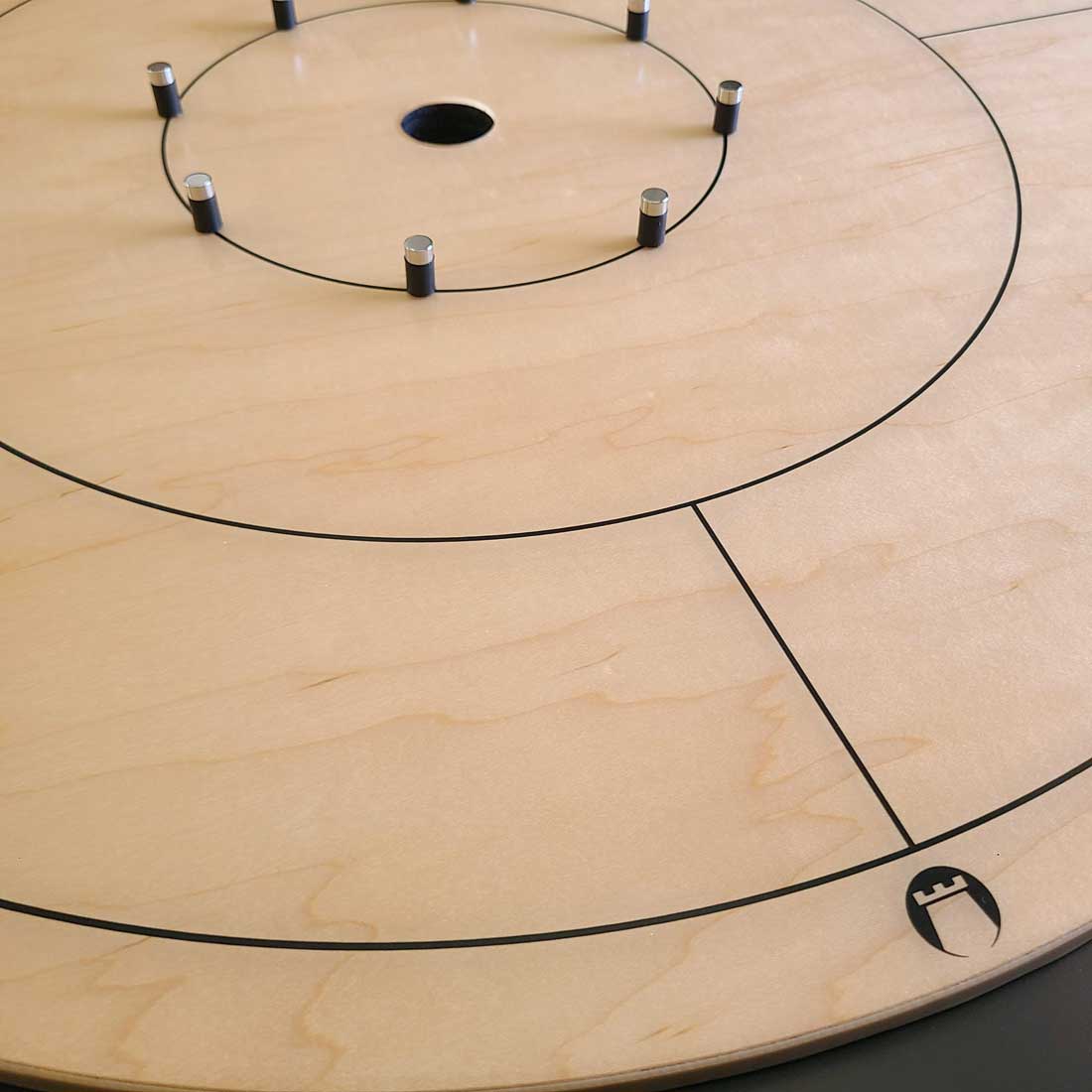 Durable Finish: A smooth polished resin, tops the 1/2" maple plywood playing surface, finished with edge banding, creating a classic look. The play is encompassed by a black metal base with heavy duty rubber feet for a very sturdy board.