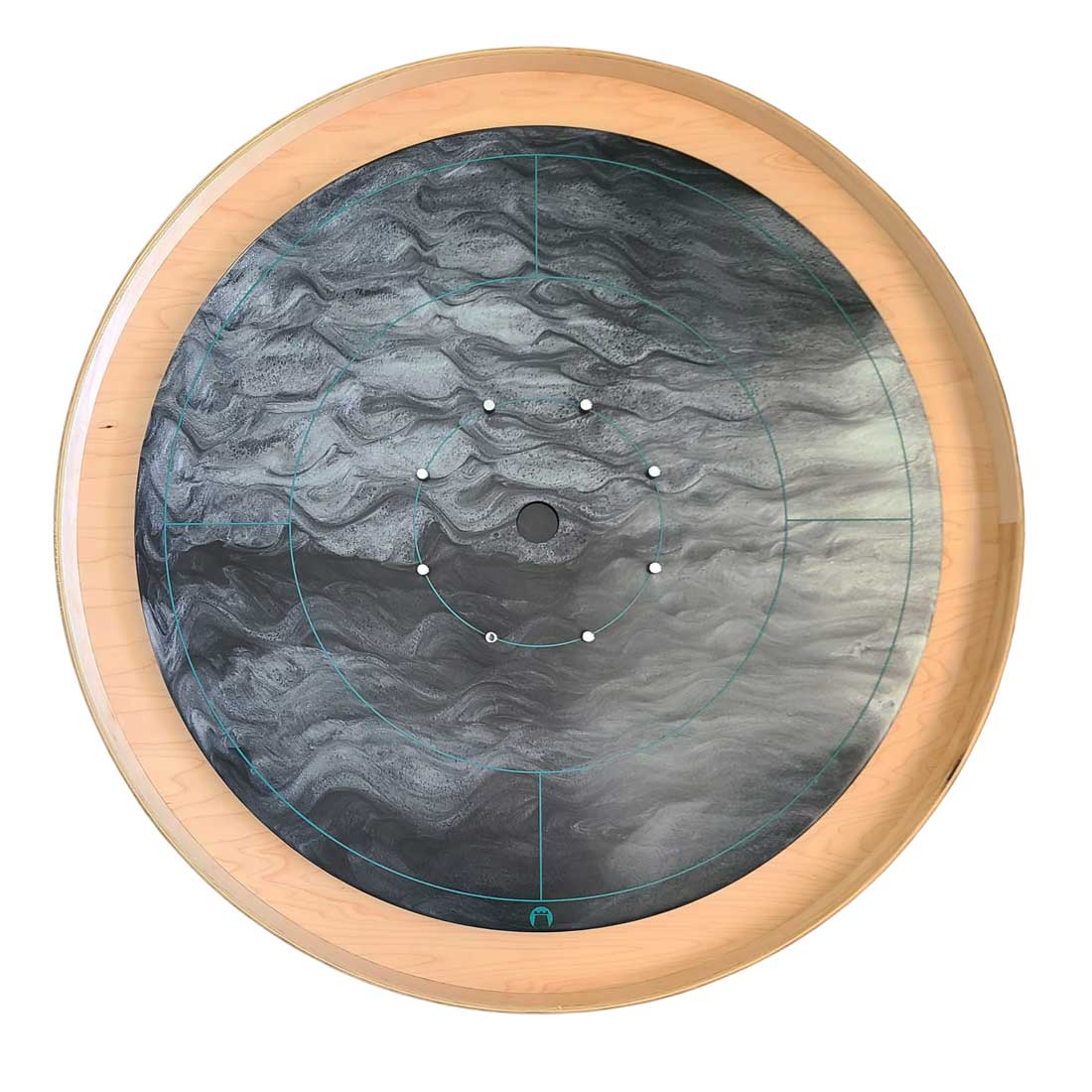 A one of a kind resin board featuring wavy tones of grey on a natural wooden rail.