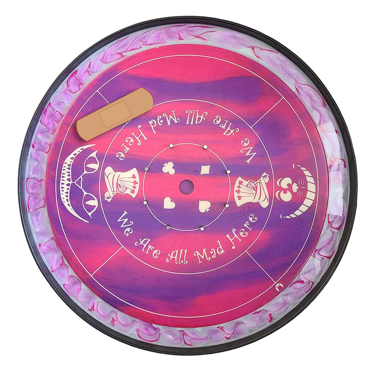 This one of a kind resin Crokinole board features wonderland fantasy art and a resin surround. There is a small dent in the rail.