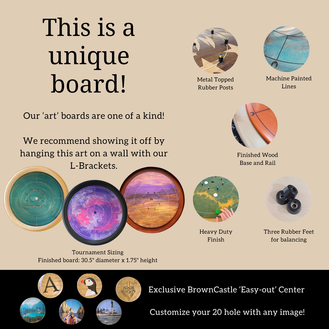 Unique Features: With our thicker playing surface, your discs in the gutter won't interfere with out-of-play shots. Plus, we've created beautiful pegs you won't find elsewhere. The reflex post, topped with stainless caps accentuate your board, giving it extra beauty.