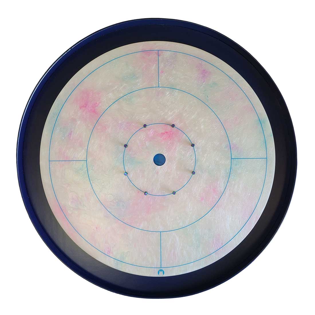 A unique resin Crokinole board featuring a dappling of pink and blue on a navy rail.
